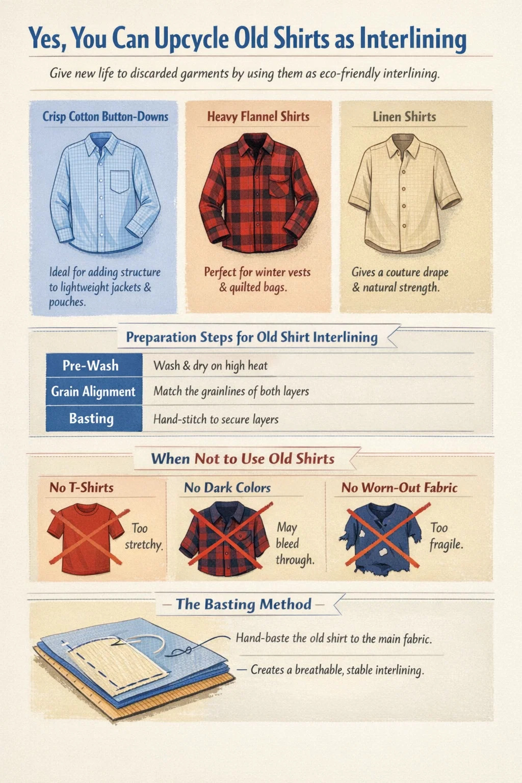 Lyhyt vastaus on vaikuttava kyllä . Käyttämättömät tai vanhat paidat voivat toimia erinomaisena, ympäristöystävällisenä ja kustannustehokkaana interline erilaisiin ompeluprojekteihin. Hylättyjen vaatteiden käyttäminen sisäkerroksena on vanhanaikainen räätälöintiperinne, joka tunnetaan nimellä "tekeminen". Menestys riippuu kuitenkin täysin siitä, kuinka paidan materiaaliominaisuudet – kuten sen kuitupitoisuus, kudos ja paino – sovitetaan uuden projektisi tarpeisiin. Oikein tehtynä vanha puuvilla- tai flanellipaita tarjoaa tarvittavan rungon, vakauden ja lämmön ilman synteettisiä, kaupasta ostettuja stabilointiaineita.