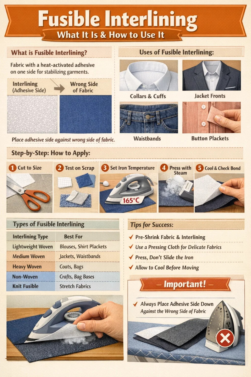 - Kuitujen yhteensopivuus: Yhdistä interlinen hoitovaatimukset muotikankaallesi. Jos kankaasi on vain kuivapesua, käytä kuivapesuun soveltuvaa välivuoria. Jos teet pestävän vaatteen, varmista, että välivuori on tarkoitettu toistuvaan konepesuun – jotkin sulavat liimat hajoavat toistuvien pesukertojen jälkeen.