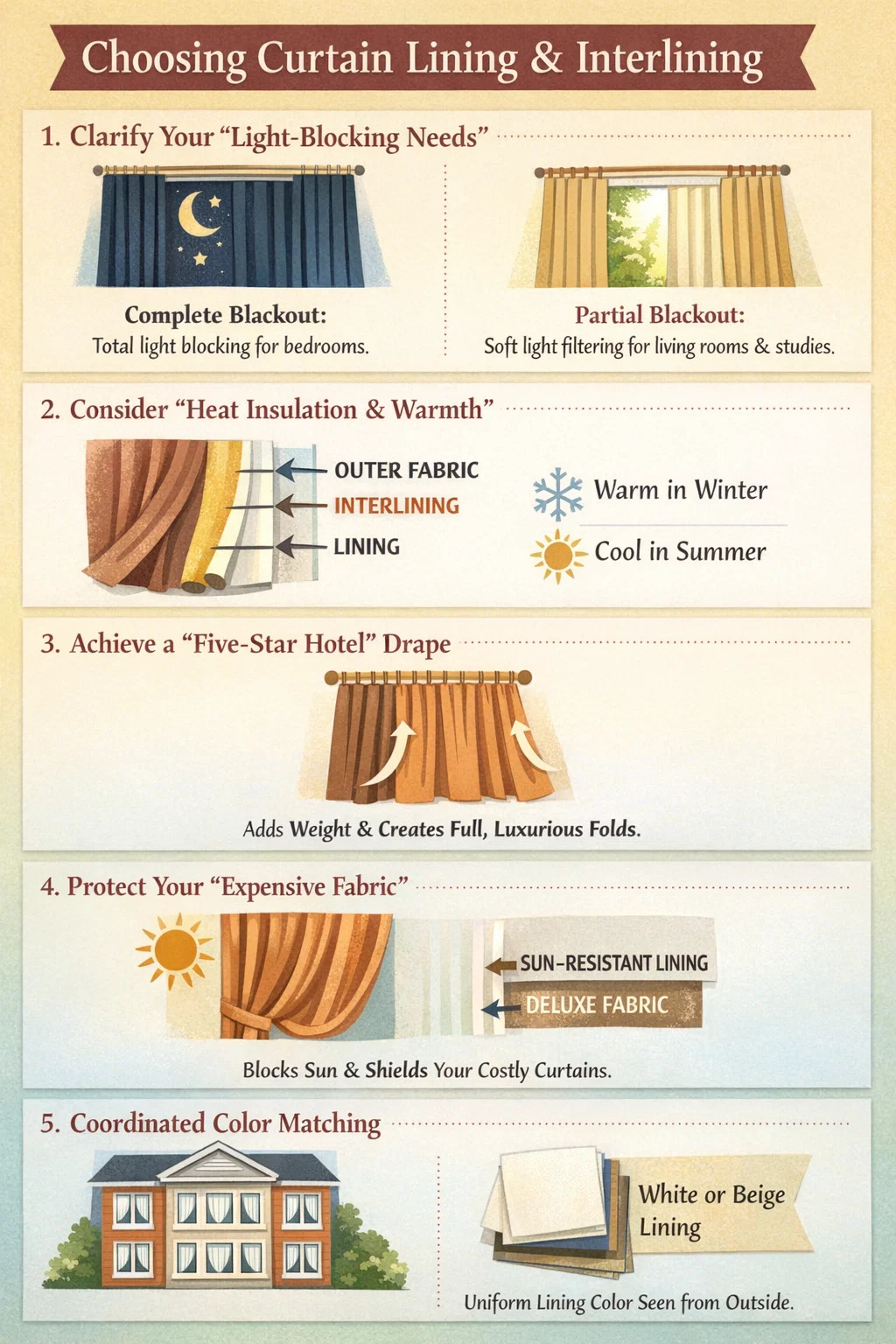 Verhoverhojen valinta ja interlining on kuin pukeisit verhot "alusvaatteisiin" ja "päällysvaatteisiin". Päällyskangas määrittää, kuinka kauniilta verhot näyttävät, kun taas nämä kaksi sisäkerrosta määrittävät niiden toimivuuden ja hyvin peittävän.