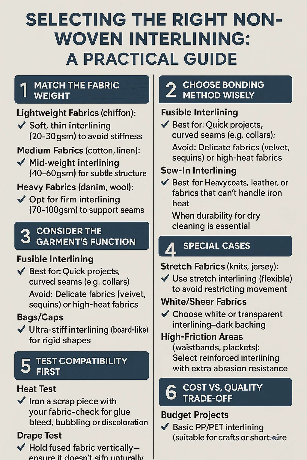 Raskaat kankaat (denim, villa): Valitse kiinteä interlining (70-100GSM) saumien ja reunojen tukemiseksi.