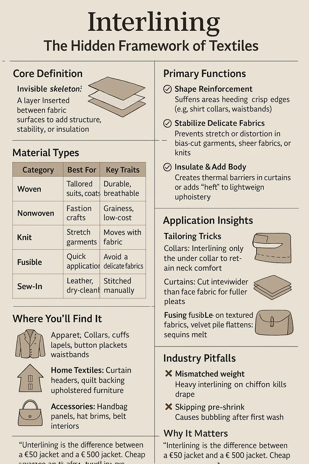 "Näkymätön luuranko": Kangaspintojen väliin asetettu kerros rakenteen, stabiilisuuden tai eristyksen lisäämiseksi.