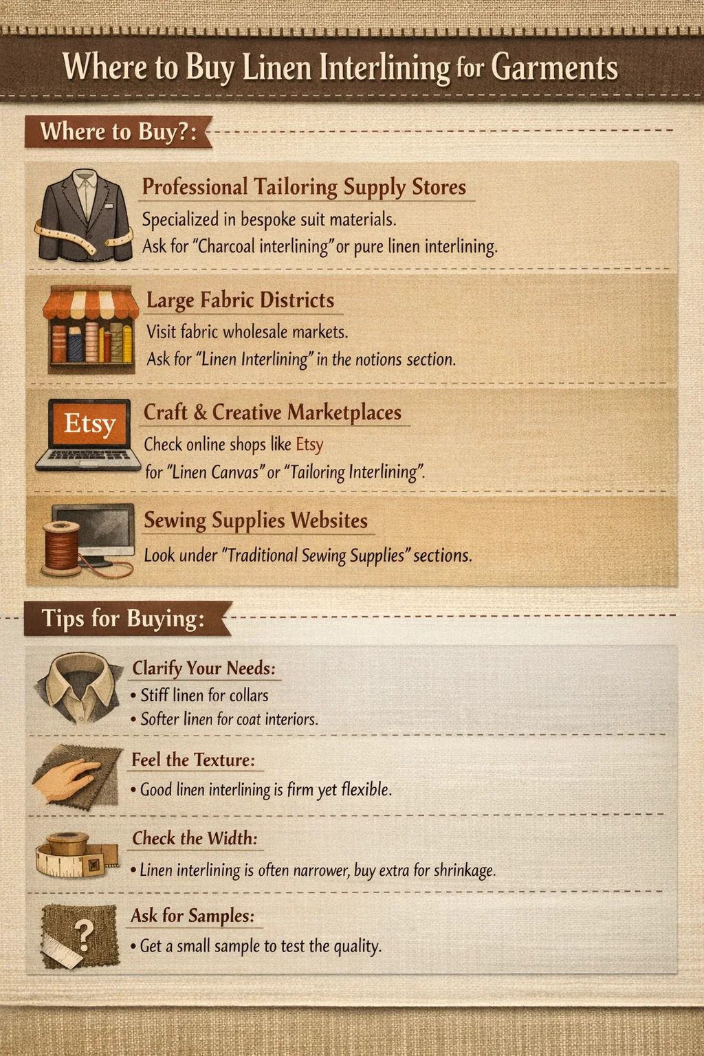Jos aiot ostaa liinavaatteita interline tai liitäntä vaatteiden valmistukseen, on olemassa useita luotettavia lähteitä, joita voit tutkia. Koska pellava on suhteellisen korkealuokkainen materiaali, jota käytetään mittatilaustyönä tehdyissä puvuissa ja korkealaatuisissa valmiissa vaatteissa, sinun on etsittävä erikoistuneita kangasliikkeitä.