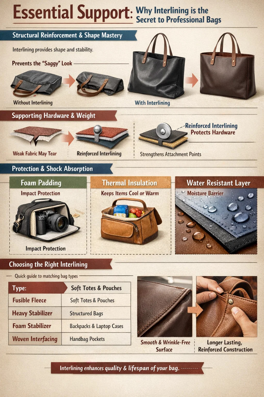 Ensisijainen syy käyttää interline pussin rakentamisessa on tarjota rakenteellinen eheys ja pitkäaikainen muodon säilyminen jota kangas ei yksinään voi saavuttaa. Ilman tätä piilotettua kerrosta useimmat pussit romahtaisivat oman painonsa tai sisällä olevien esineiden painon alaisena ja näyttävät velttoilta, ryppyisiltä ja keskeneräisiltä. Lisäämällä oikea interline , muutat yksinkertaisesta kankaasta toimivan 3D-objektin, joka seisoo pystyssä, suojaa sen sisältöä ja kestää päivittäisen käytön rasitukset.